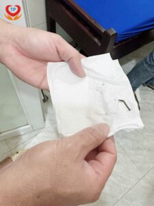 Qua thăm khám lâm sàng và nội soi, các bác sĩ phát hiện một con rết còn sống, đang di chuyển trong ống tai ngoài, gây tổn thương niêm mạc. Dị vật đã được gắp bỏ an toàn, tai được vệ sinh và kiểm tra tổn thương.